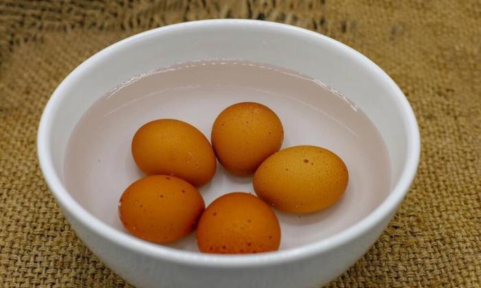 2. 將雞蛋放入鹽水中清洗,這樣做有兩大好處:一是可以消毒殺菌,去除雞蛋表面的髒東西;二是濃鹽水密度大,能夠檢驗雞蛋是否新鮮。若雞蛋全部沉在盆底,說明雞蛋裡面水分較多,比較新鮮;若雞蛋浮在水中或水面上,則證明雞蛋內部出現空氣,新鮮程度大大降低,這樣的雞蛋就不要再食用了。