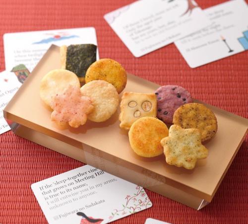 70年老店「小倉山莊」,以自家栽培的京都米制作美味健康的煎餅,在日本廣受歡迎。共有原味、蝦櫻花、海苔捲、甜醬油、紫芋、砂糖、杏仁焦糖、七味香辣、咖哩、起司十種口味,加上一百種不同的歌牌和風個包裝,充滿雅緻的和歌風情及日本文化之美,是伴手禮的好選擇。
